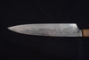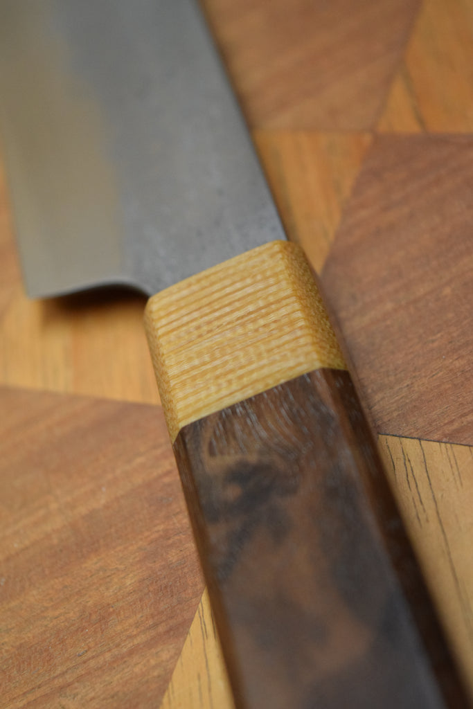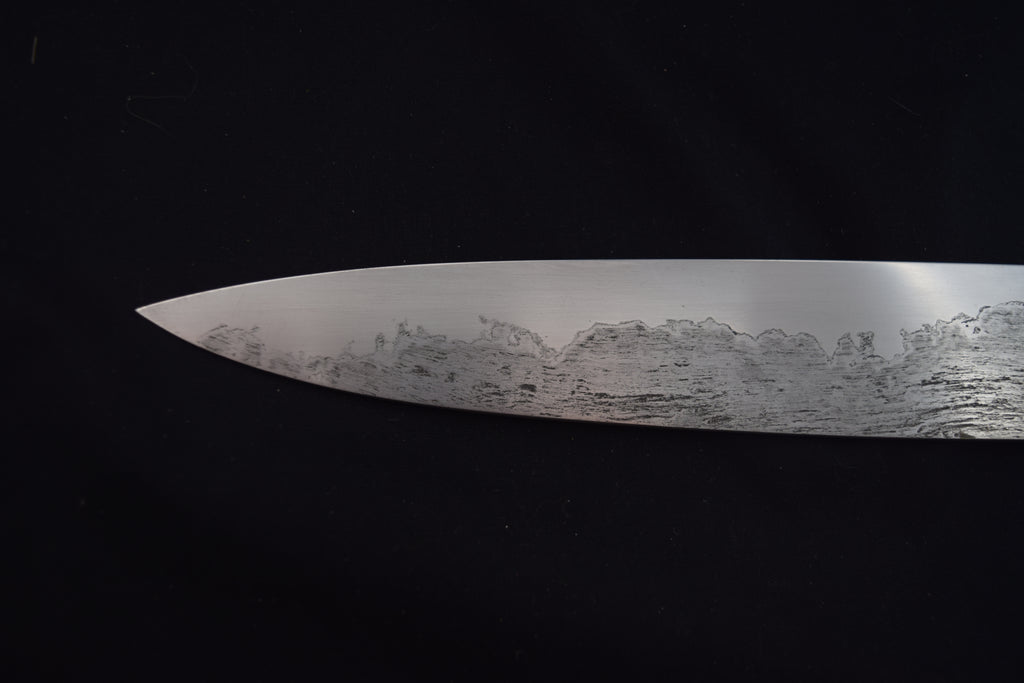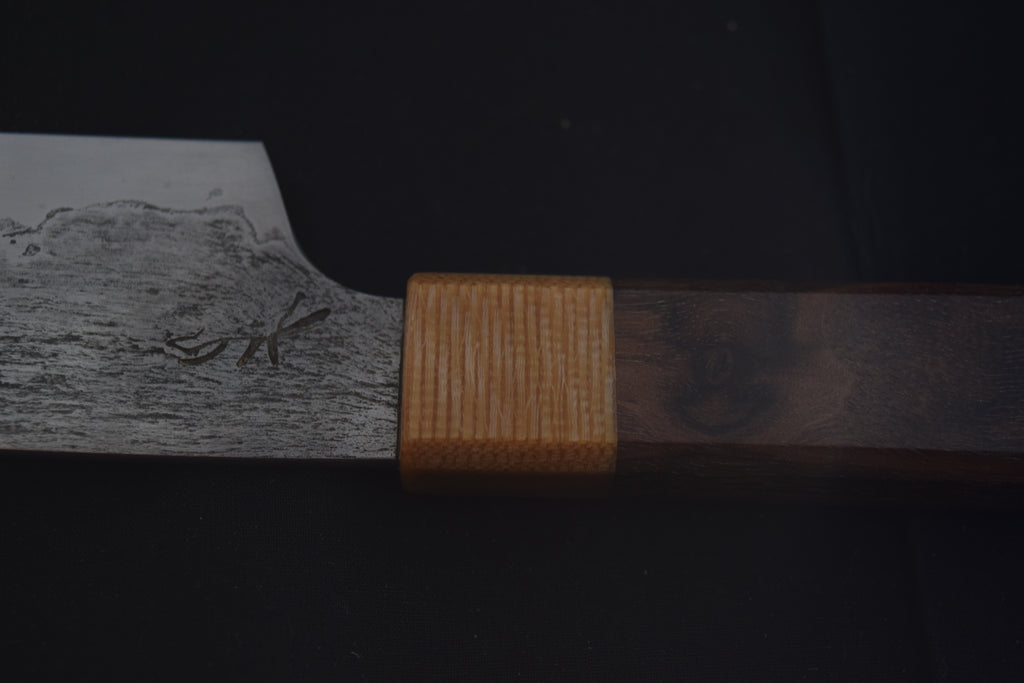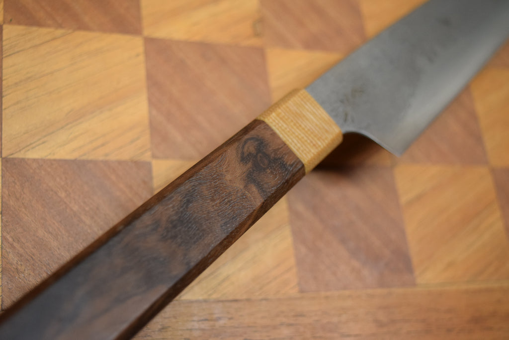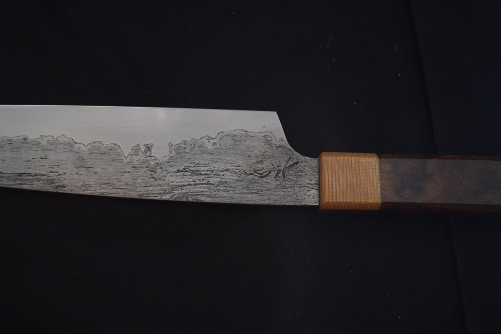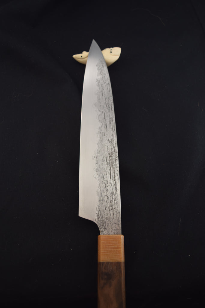 Slicer/gyuto made in anchor chain wrought iron and 1084 high carbon steel. The highly figured wrought iron cladding, thin, light knife with house stabilized Claro walnut and vintage micarta bolster. Thin, light but balanced knife. Handle is long, so as to be customized to buyers preference.