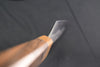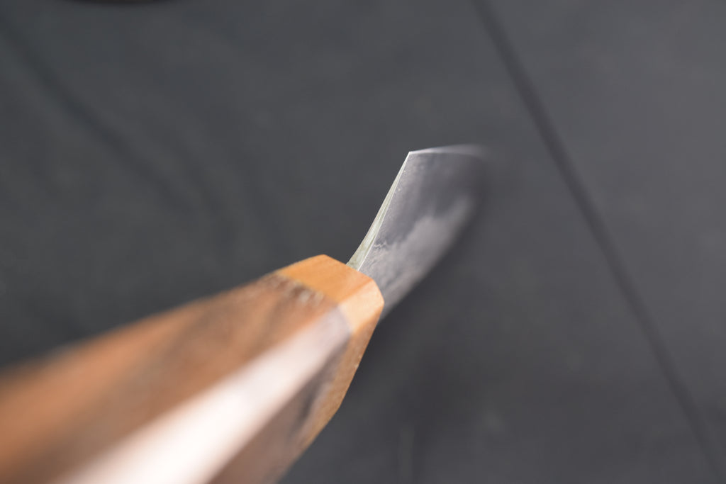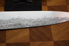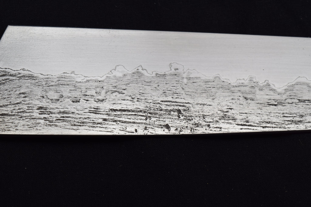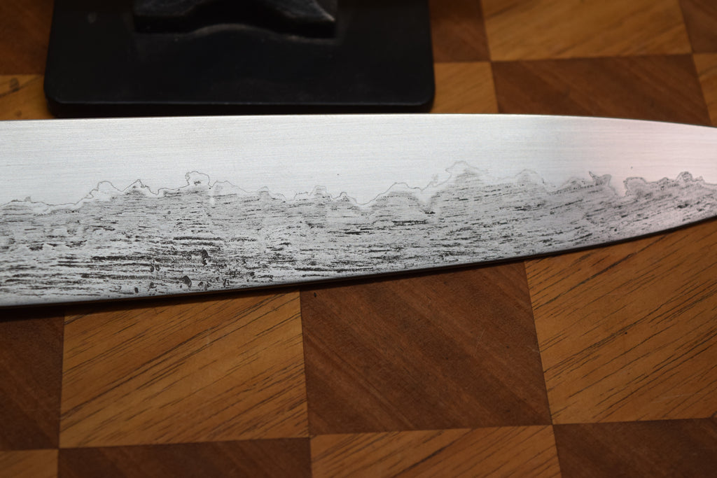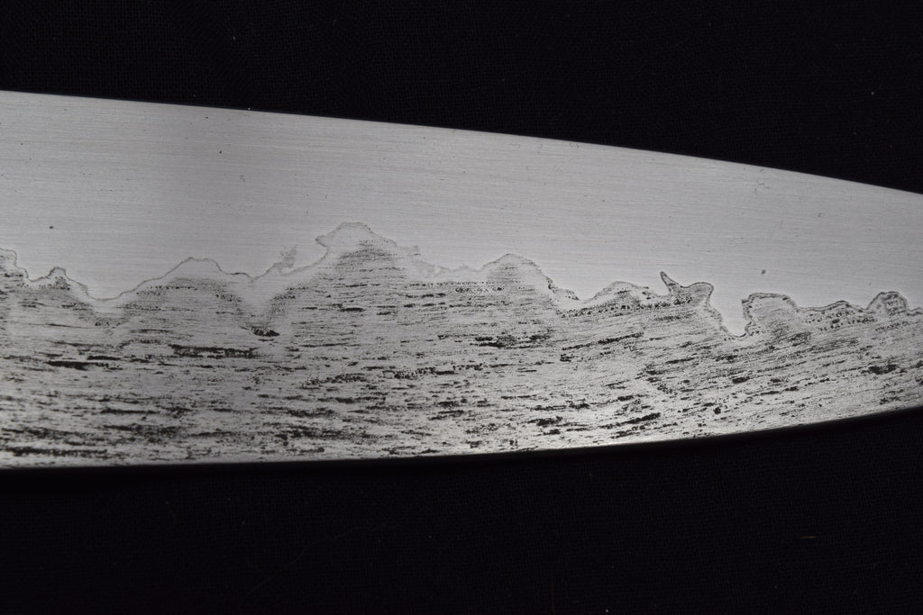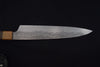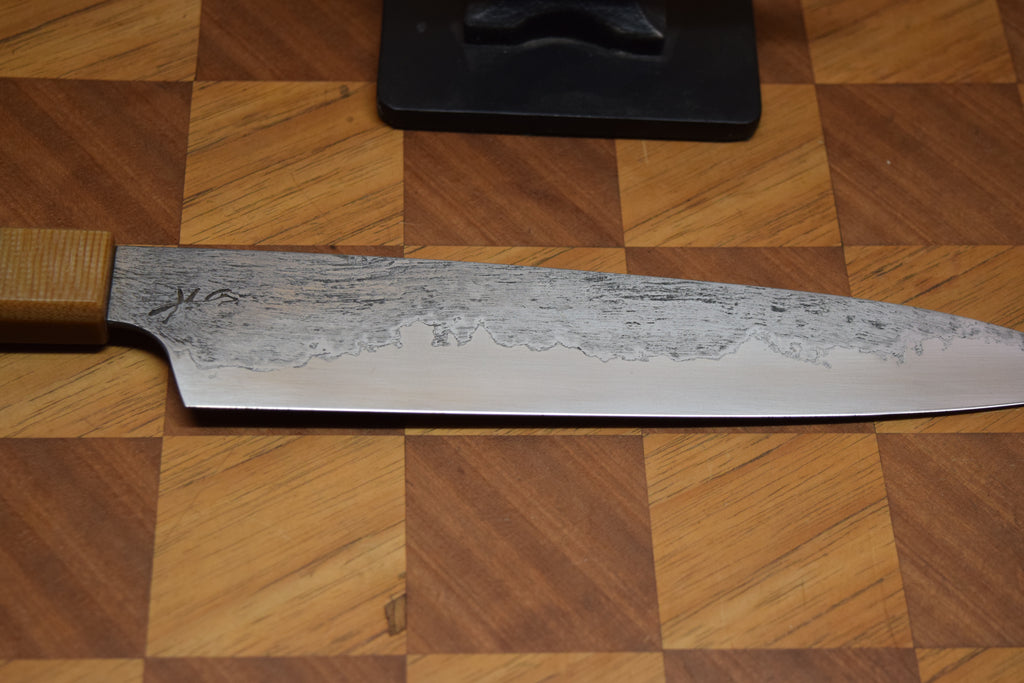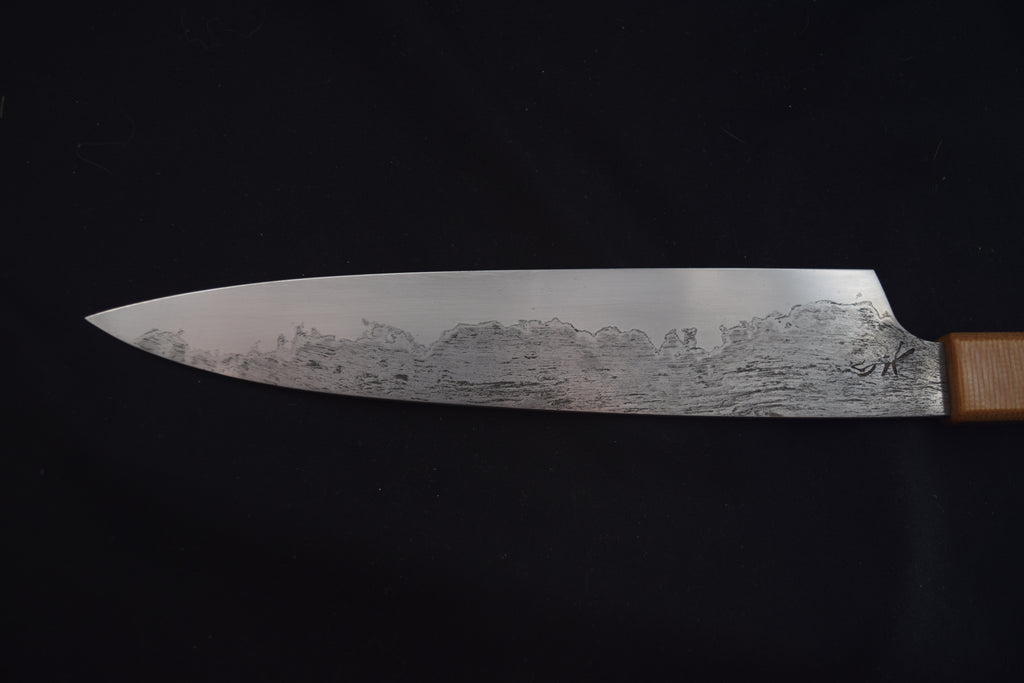 Slicer/gyuto made in anchor chain wrought iron and 1084 high carbon steel. The highly figured wrought iron cladding, thin, light knife with house stabilized Claro walnut and vintage micarta bolster. Thin, light but balanced knife. Handle is long, so as to be customized to buyers preference.