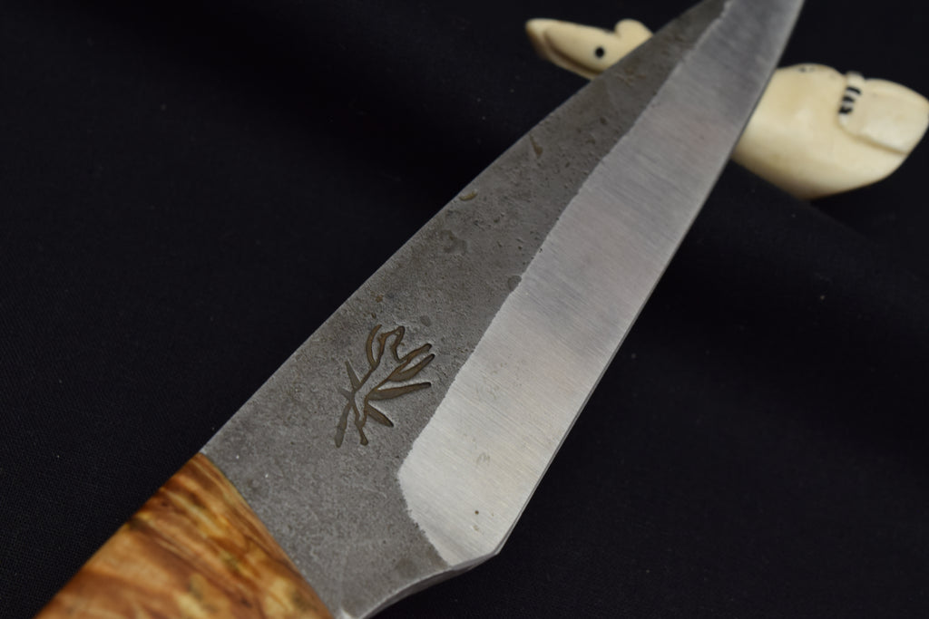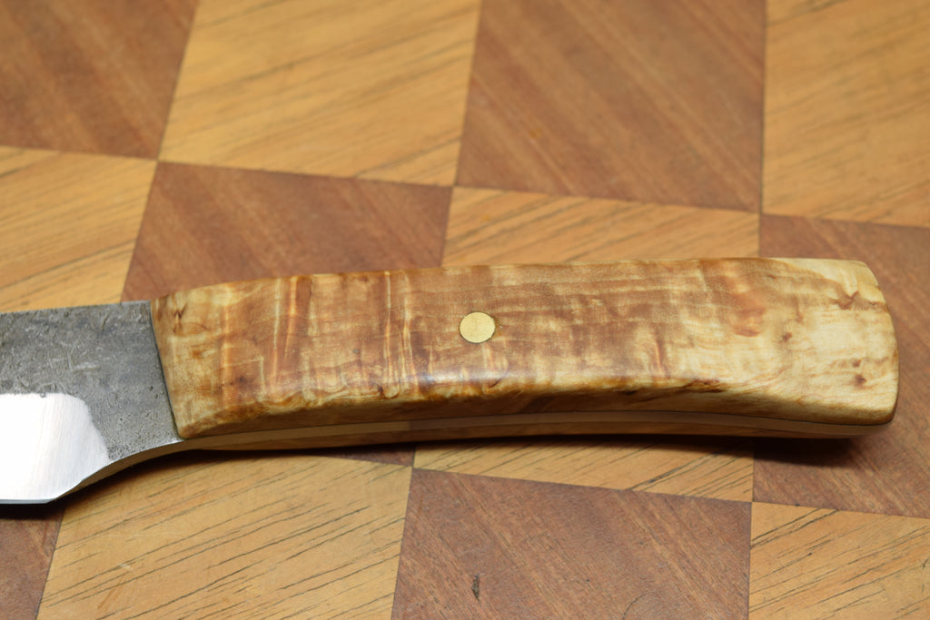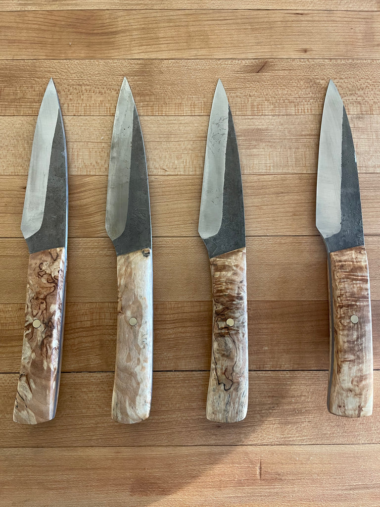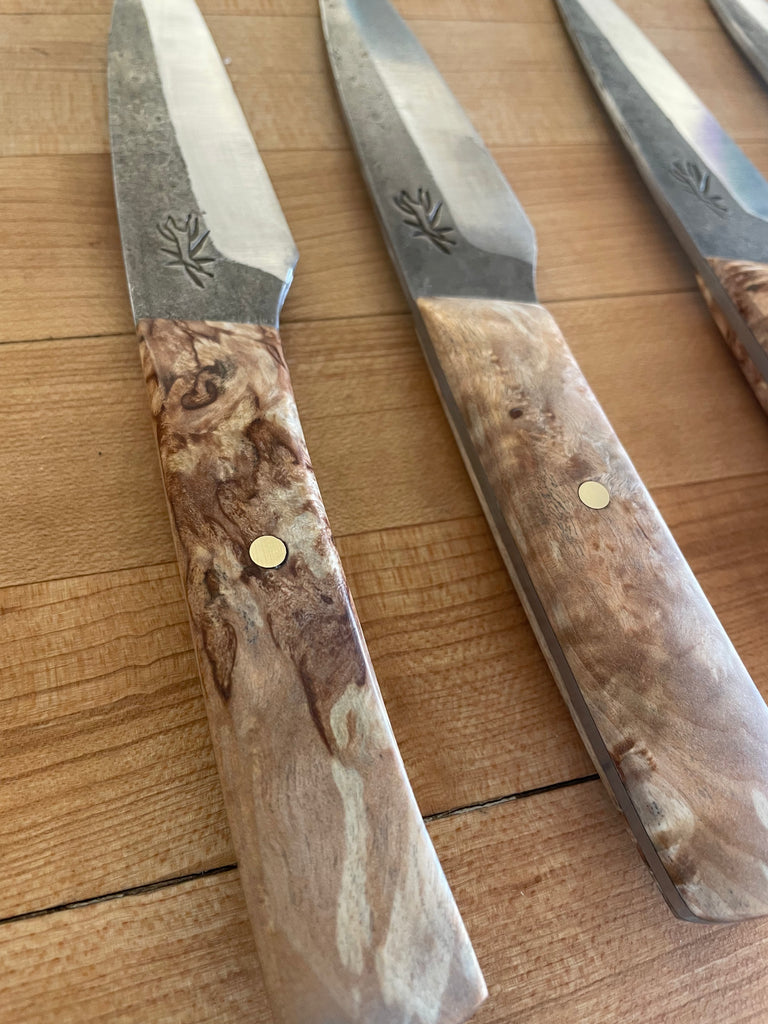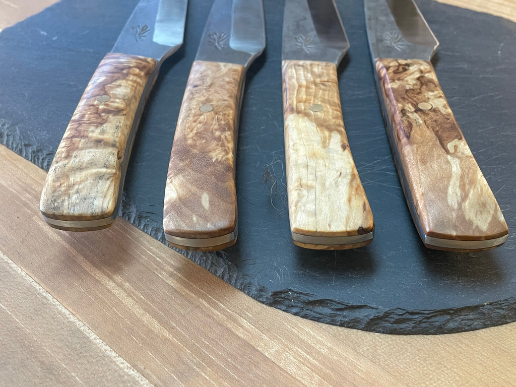 Recycled high carbon steel with stabilized Karelian Birch handles.